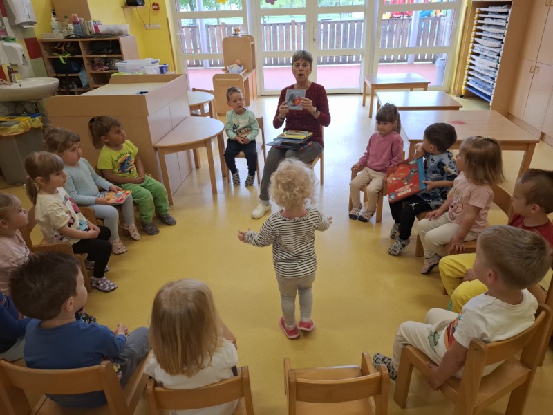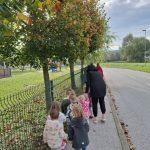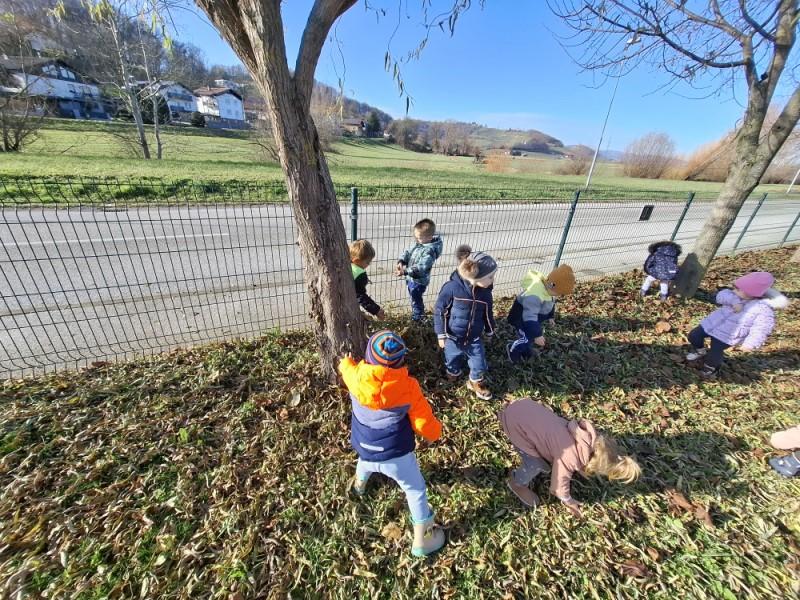 Otroci pridno poslušajo pravljice, raziskujejo in spoznavajo plodove jeseni, ob lepem vremenu pa uživajo v naravi.