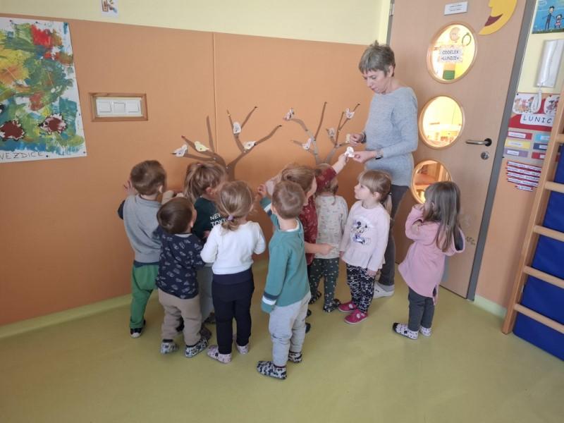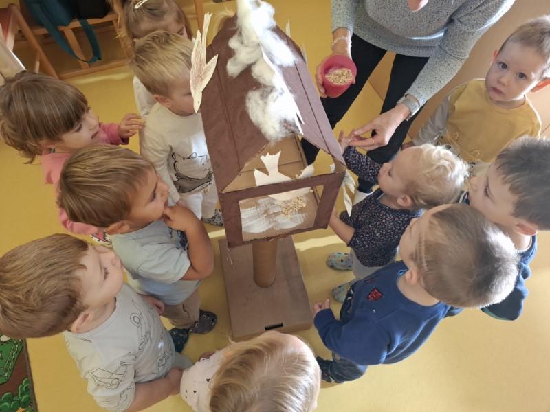 Zima se približuje, zunaj je vedno bolj mrzlo, zato si živali vedno težje najdejo hrano. V skupini Lunice so otroci izdelali pravo ptičjo hišico v katero so že prileteli ptički. Prav tako pa skrbimo za tiste prave ptičke, katerim nastavljamo hrano zunaj, tudi ježku smo naredili brlog iz listja.