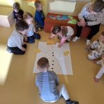 Otroci nestrpno čakajo sneg, da bi lahko delali snežaka, a zime od nikoder. Da pa bo v skupini vsaj malo zimskega vzdušja, smo snežaka narisali, otroci pa so ga primerno oblekli.