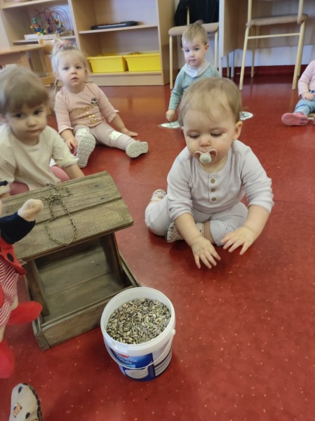 V zimskem času poskrbimo za ptice. V okolici vrtca nastavimo ptičje hiške, katere polnimo s hrano. V skupini pa pojemo pesmi o pticah, plešemo, posnemamo gibanje ptic, igramo na ritmične instrumente, izdelujemo ptičke, skratka uživamo v različnih dejavnostih.