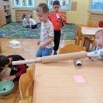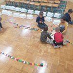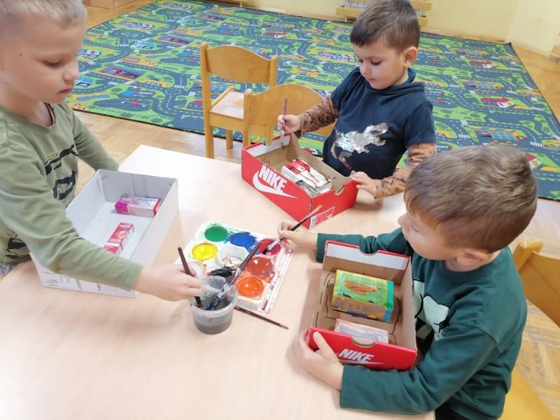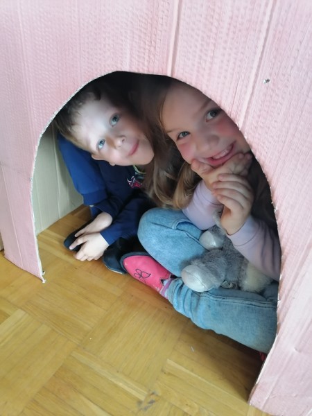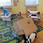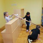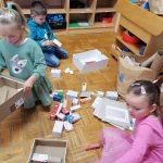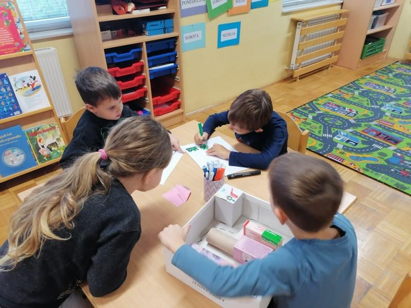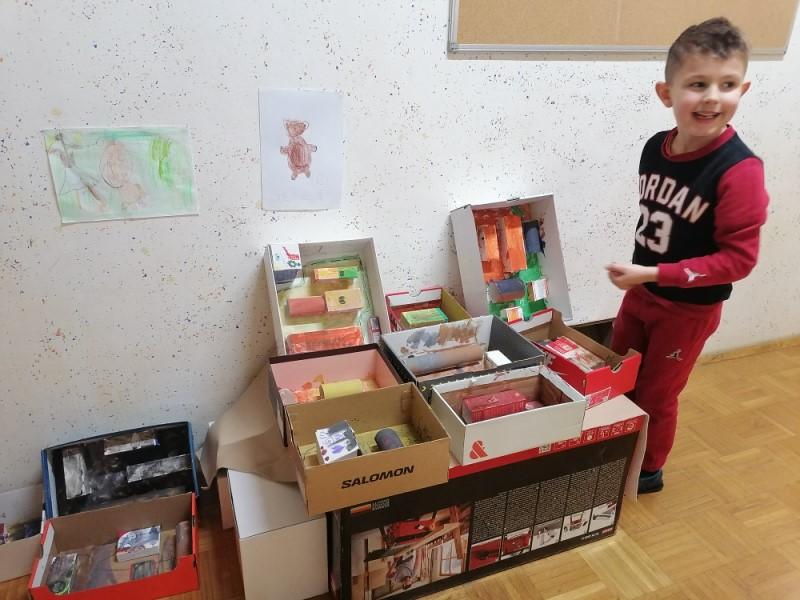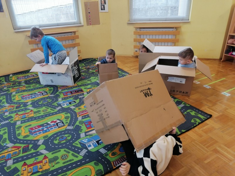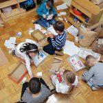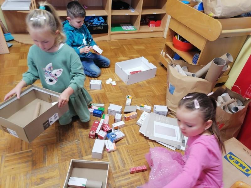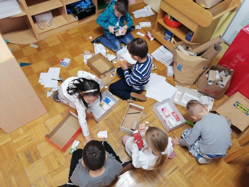 Otroci si iz škatel različnih velikosti in tulcev izdelajo vsak svoj labirint v večji škatli za čevlje.