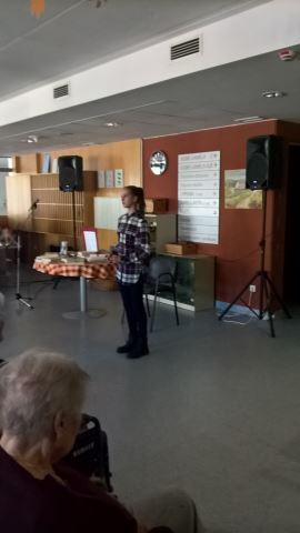 Naš trobentač Gašper Valentan je s trobento razveselil oskrbovance doma s tremi pesmimi. S tem kar počneta v prostem času, kar ju veseli in v čem sta odlični, pa sta se predstavili še Kaja Pešl na klarinetu s čudovito pesmijo Kje so tiste stezice in Julija Herzog, ki je s svojim vrhunskim baletnim nastopom ganila prav vsakega izmed nas.