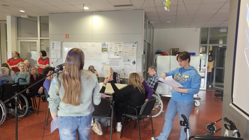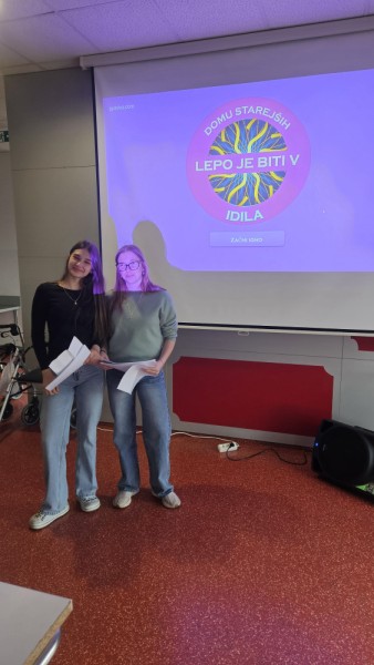 V torek, 15. aprila je 11 učenk devetih razredov (Marina Cehtl, Ema Metličar, Tjaša Bohl, Klara Fluher, Lana Šamec Kurnik, Ella Thaler Perovic, Ava Črnko, Anja Fras, Marija Bratuša in Julija Rečnik) v spremstvu dveh učiteljic obiskalo Dom starejših Idila v Vukovskem dolu. Tokrat smo se pomerili v znanju. Za starostnike smo pripravili kviz z naslovom »Lepo je biti v domu starejših Idila«. Učenke in oskrbovanci so bili razdeljeni v tri skupine – Deževniki, Marjetice in Mladost bo tudi starost, imeli pa smo tudi nekaj občinstva. Voditeljici kviza sta postavljali vprašanja, člani skupine pa so se med seboj posvetovali in nato odgovarjali na zastavljena vprašanja.